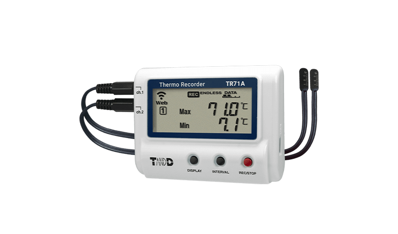 The TR71A is a temperature logger with two available sensor connections and can measure from -60 to 155℃. The wide range of optional sensors provides increased measurement flexibility. The LCD screen allows the simultaneous display of either the current values of two channels, the highest and lowest values of channel 1, or the highest and lowest values of channel 2. The ALM icon on the LCD alerts the user of the occurrence of an alarm. Use the wireless LAN feature to auto-upload data to the cloud for anytime anywhere access and get warning notices. Bluetooth communication allows you to view data, create reports and make settings from a smartphone or tablet. Connect to a PC with a USB cable to download recorded data, create reports and make setting changes. The software application used with the TR71A has a "Vaccine Mode", which meets or exceeds CDC requirements for VFC, and is useful for monitoring and recording vaccine temperatures. TR71A is useful not only in research labs and hospitals, but also in homes, offices, and other industries.