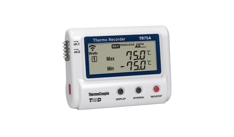 The TR75A is a temperature logger with two thermocouple (K, J, T, E, S, R) sensor connections. It is capable of measuring temperatures ranging from -199 to 1760°C, and can be used in very high temperatures such as in a plant furnace or in deep freezers where temperatures reach very low levels. Functional buttons on the device allow you to make settings and start/stop recording. Use the wireless LAN feature to auto-upload data to the cloud for anytime anywhere access and get warning notices. Bluetooth communication allows you to view data, create reports and make settings from a smartphone or tablet. Connect to a PC with a USB cable to download recorded data, create reports and make setting changes. The software application used with the TR75A has a "Vaccine Mode", which meets or exceeds CDC requirements for VFC, and is suitable for monitoring and recording vaccine temperatures. TR75A is useful not only in pharmaceutical and medical reseach labs, hospitals, but also in factories and other facilities. Note: We do not handle the sale of Thermocouple sensors.